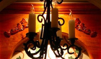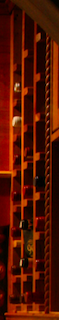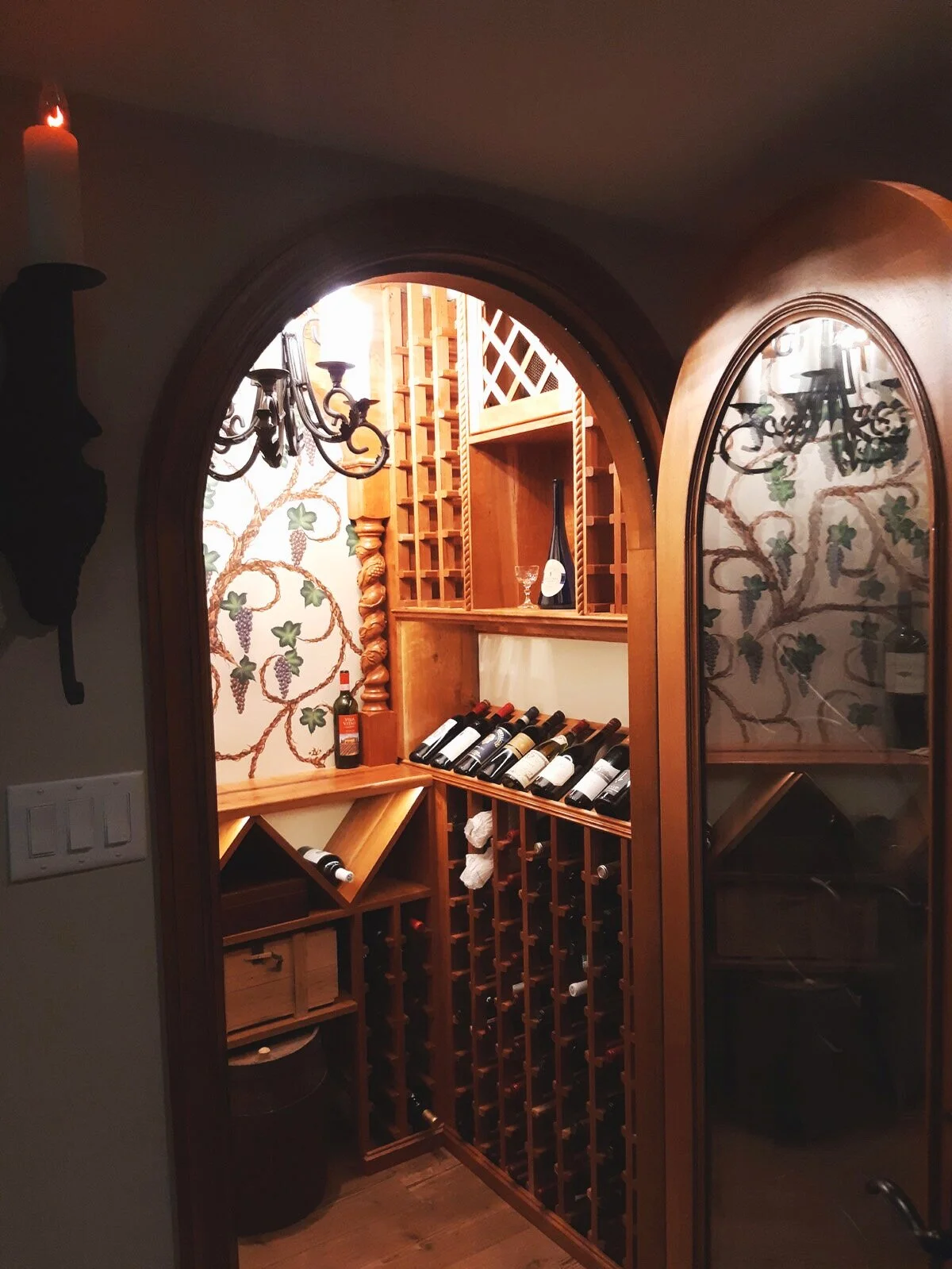 When you step inside this customized wine cellar, the attention to detail is mesmerizing. David tells us that all parts are made of solid cherry wood that he finished with several coats of Sherwin Williams pre-cat lacquer. It is insulated and chilled with a Whisper Kool chiller hidden in the upper cabinet. The racking and shelves are made of solid cherry that he harvested himself. Another charming detail is that the mural was painted by David’s daughter.